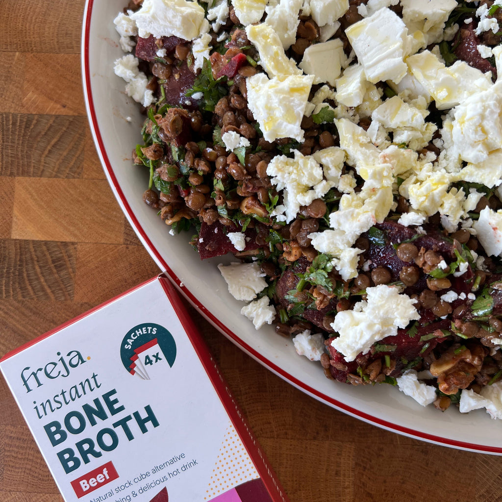 - To make the lentils, combine all of the lentil ingredients with the Freja Instant Beef Bone Broth into a sauce pan.
