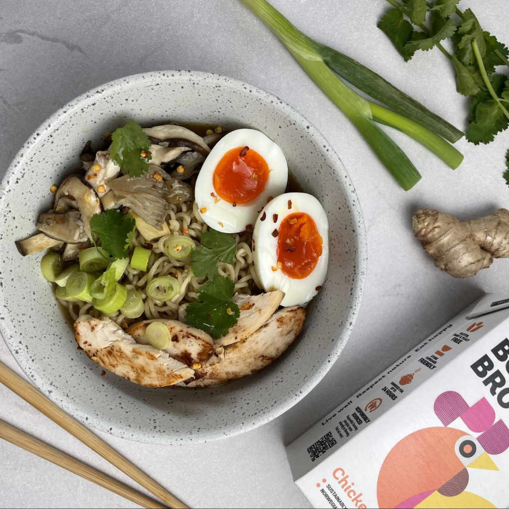 - In a large pan, add the Freja chicken bone broth, garlic and ginger. Bring to a boil over high heat, then reduce the heat to low and let it simmer for 20-30 minutes to infuse the flavours. Add the ramen for the last 10 minutes (or however long the packet instructions say they need to cook for).