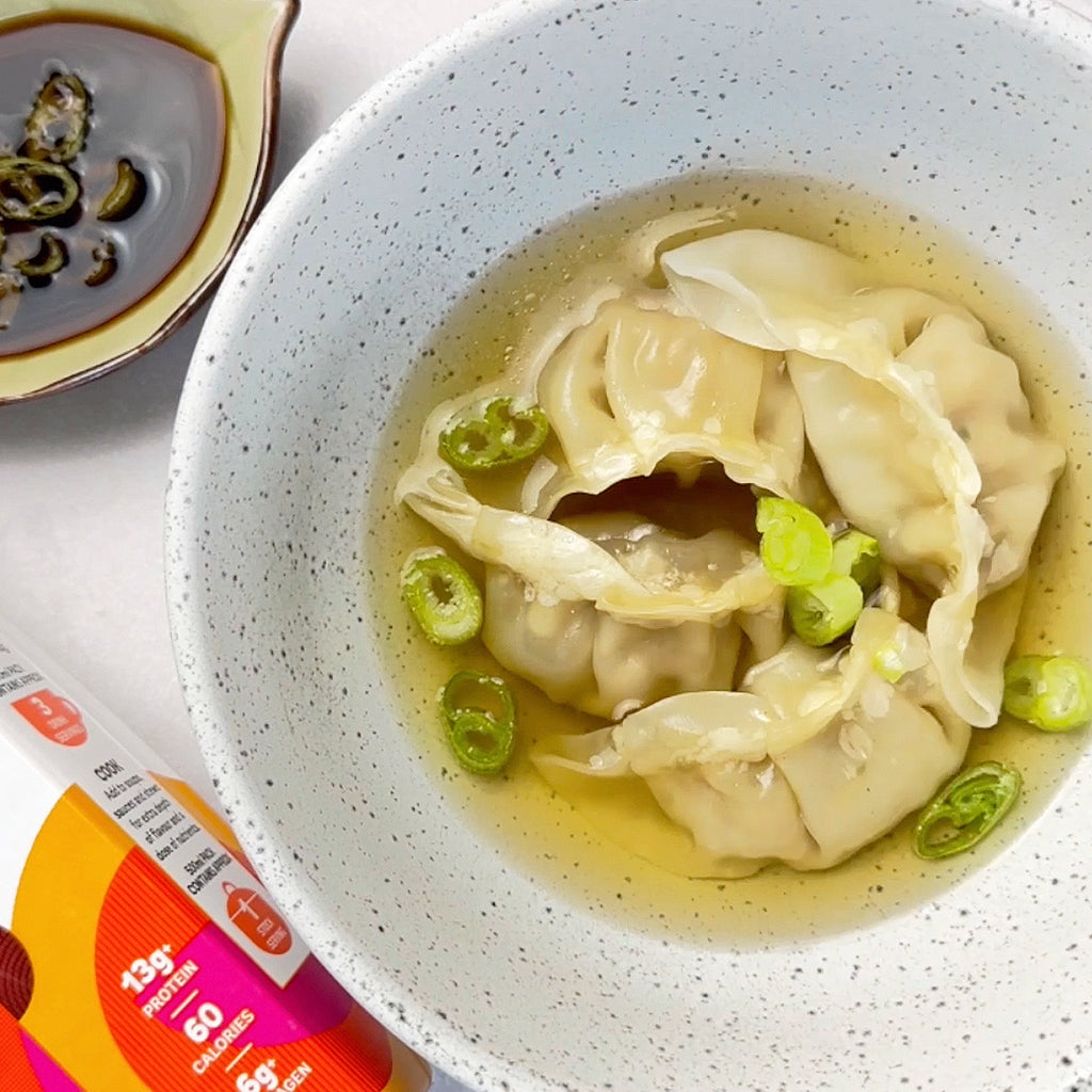 Freja chicken bone broth boosted with steamed Gyoza and spring onion.