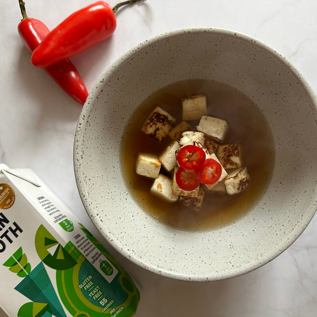 Slice some paneer into cubes and fry until golden brown. Tip into a bowl and pour over some warmed Freja Vegan Broth. Garnish with some finely sliced fresh red chilli.