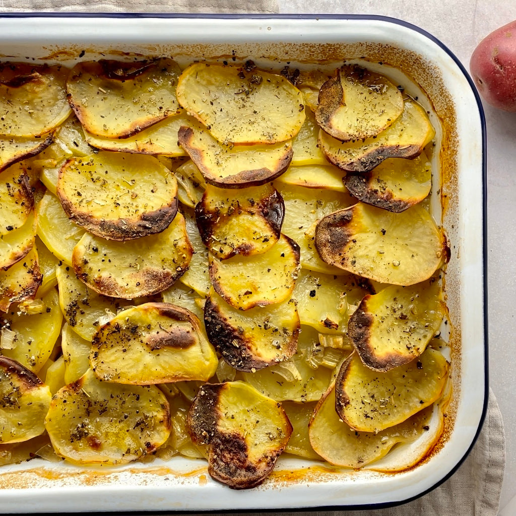 - Slice your potatoes thinly, not too thin though as you want them to hold their shape. Then halve your onions and finely slice.