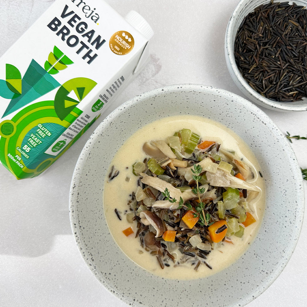 - Pour in the Freja vegetable broth, lemon juice, cooked wild rice and water and bring to a simmer.