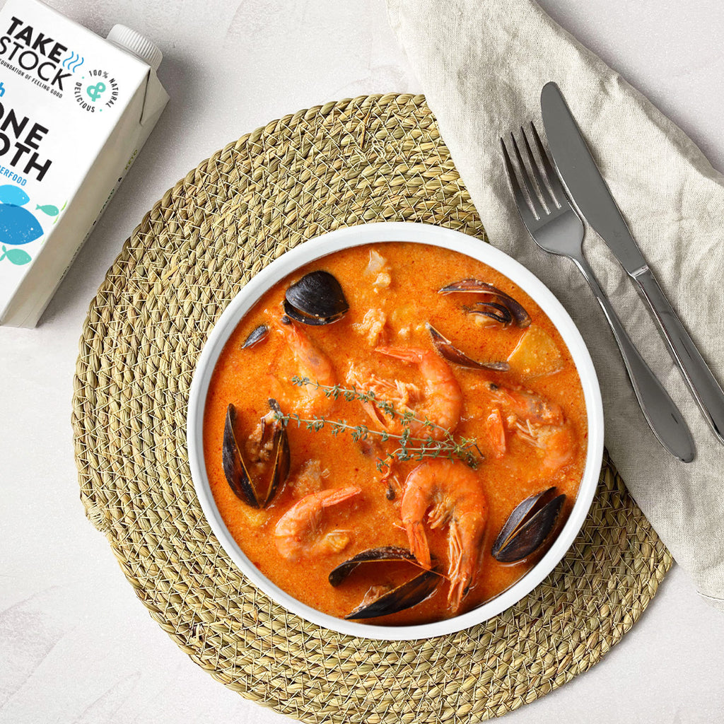 - Tip in the tomatoes, star anise and cayenne. Stir for a minute or two then pour over the Freja Fish Bone Broth, white wine and add the saffron and orange zest.