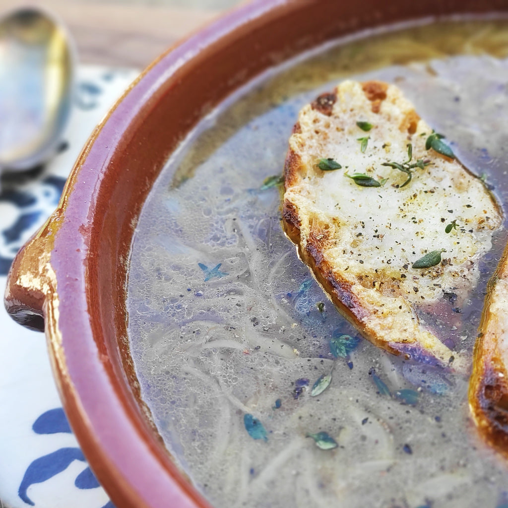 - Add a splash of sherry or brandy to the soup, remove the herbs and divide into two bowls, top with the cheese toasts and plenty of black pepper.