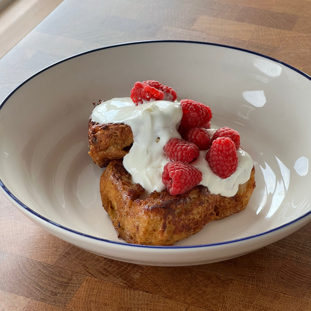 3. Fry the soaked slices of bread in butter on a low heat until caramelised on the outside.
