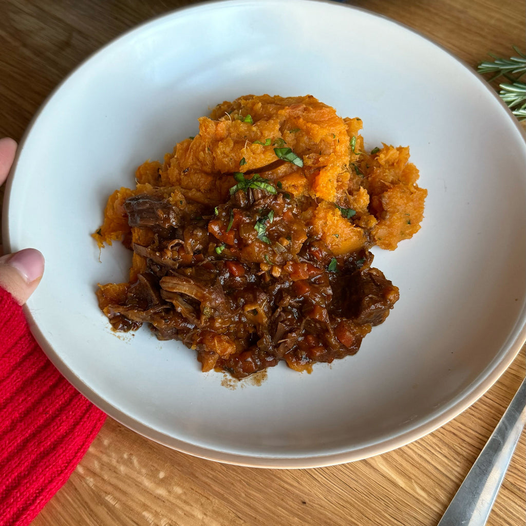9. Transfer beef mix to a baking dish and top with mashed sweet potato, smoothing the surface. Sprinkle optional cheese on top.