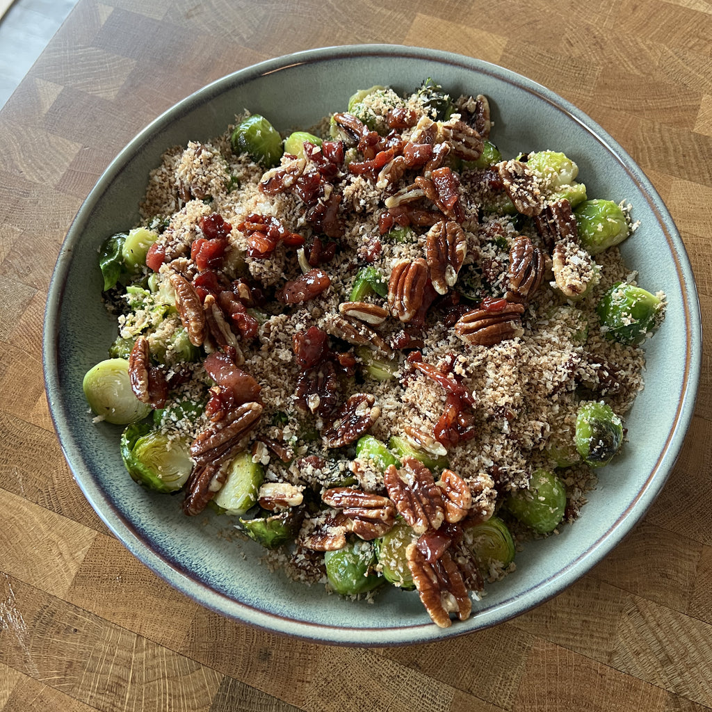 - Assemble the dish by layering the sprouts, nuts, bacon and breadcrumbs. Tuck in and enjoy!