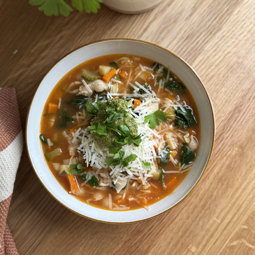 - Ladle into bowls, top with Parmesan and a swirl of basil pesto.