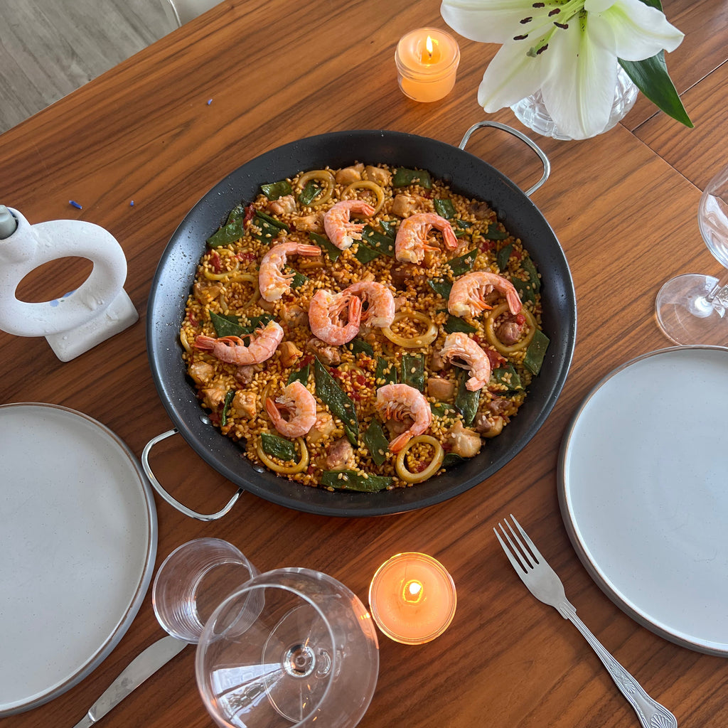 - Once all of the liquid is absorbed the rice will start to form a crispy caramelised layer at the bottom called a socarrat. This is when you know the paella is ready to serve and enjoy!