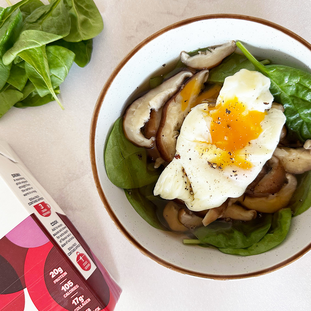 - Pour the Freja Beef bone broth into a wide pan and add the sliced mushrooms and bring to a simmer for a minute or two.