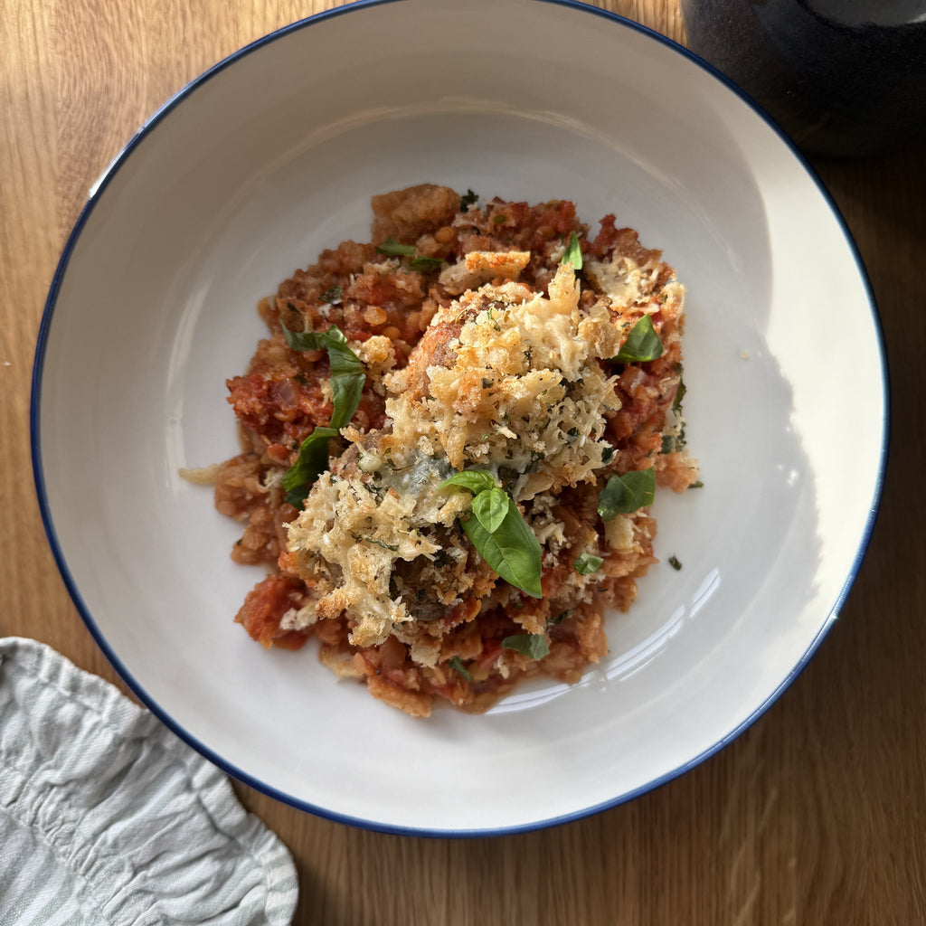 - Build the sauce: In the same pan, sauté red onion until soft. Stir in tomato purée for 1–2 minutes. Add tinned tomatoes, sundried tomatoes, red split lentils, chilli flakes, and the dissolved Freja Beef Bone Broth. Simmer 15–20 minutes, stirring occasionally, until the lentils are tender and the sauce thickens.