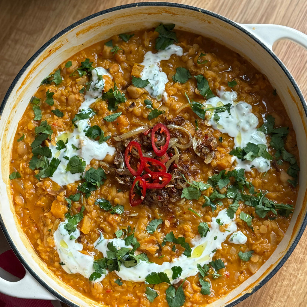 1 tbsp neutral oil or ghee1 tsp cumin seeds1 small onion, finely chopped3 garlic cloves, minced or grated1-inch piece fresh ginger, minced or grated½ red chilli, minced (or ½ tsp chilli flakes)1 ½ tbsp tomato purée300g dried red lentils, rinsed 180g cooked chickpeas150g butternut squash, peeled and cut into 1–2 cm cubes500ml Freja Classic Chicken Bone Broth + 300ml water (you may need to add more liquid as lentils absorb more than squash/chickpeas)½ tsp turmericJuice of ½ lemonCrispy onion topping2 small shallots1/4 of a white onionfinely sliced1 clove of garlic chopped1/2 tsp cumin seeds1/2 tsp fresh chopped chilli