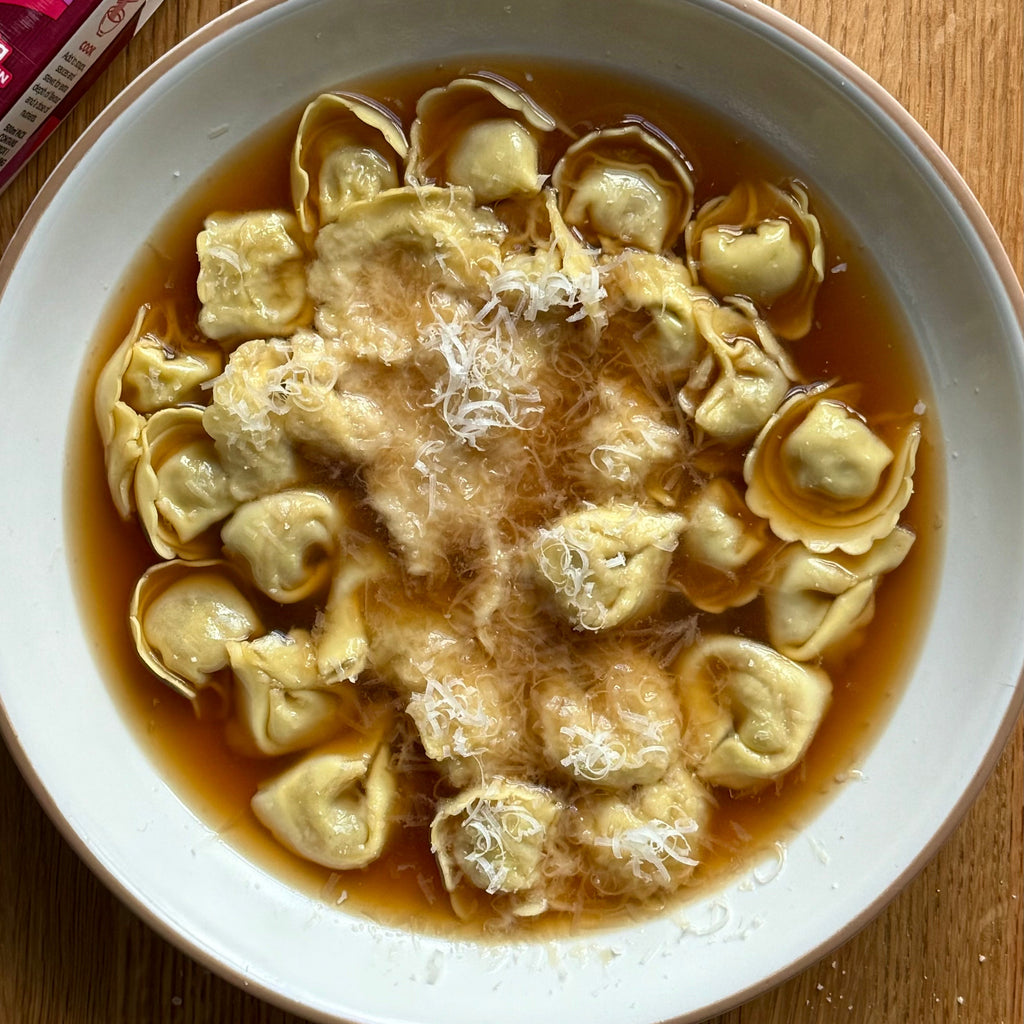 4. Add the tortellini to the hot broth and cook for 2–4 mins, or according to the packet instructions, until just tender and floating.