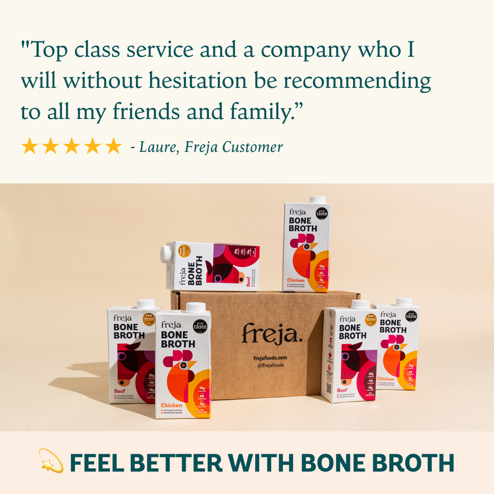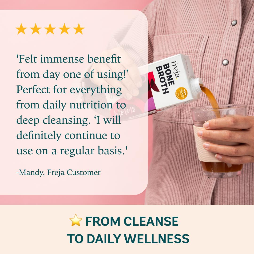 Freja Bone Broth is the perfect cleansing partner. It’s naturally high in protein which keeps you feeling fuller for longer, but is also low in carbohydrates so it won’t give you that ‘carb crash’. Bone Broth is an excellent option to help you cleanse your body naturally, or to sip on throughout the day as it keeps you well nourished and helps control hunger pangs!