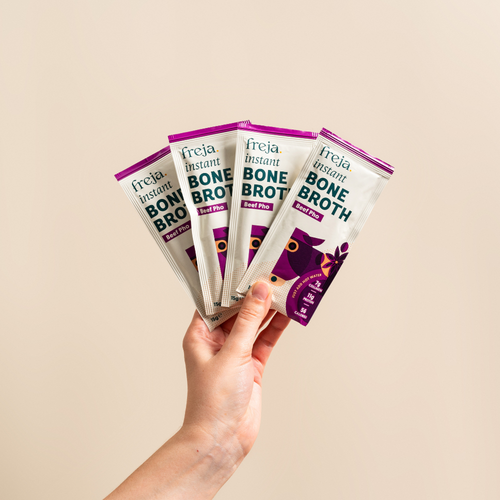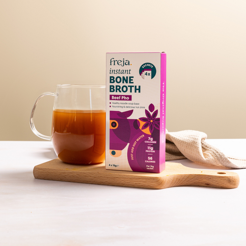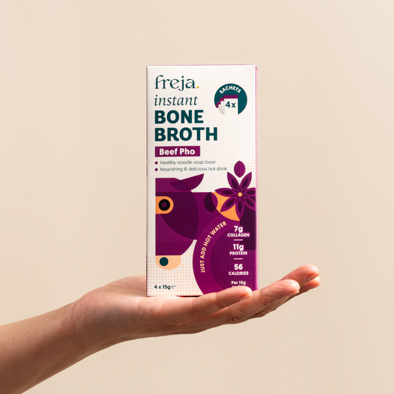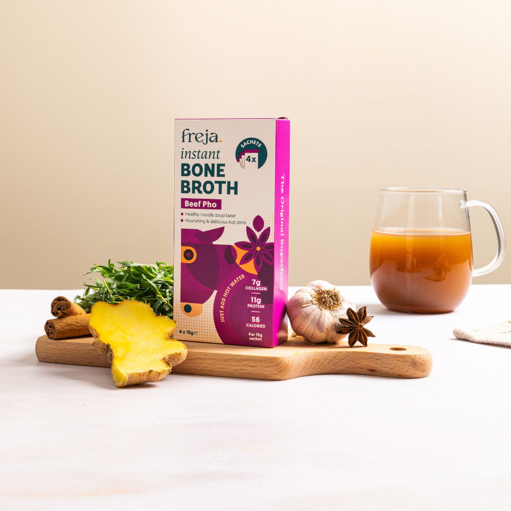 Freja Instant Bone Broth is cupboard-friendly, so you'll never be more than five minutes away from a delicious, nutritious broth.