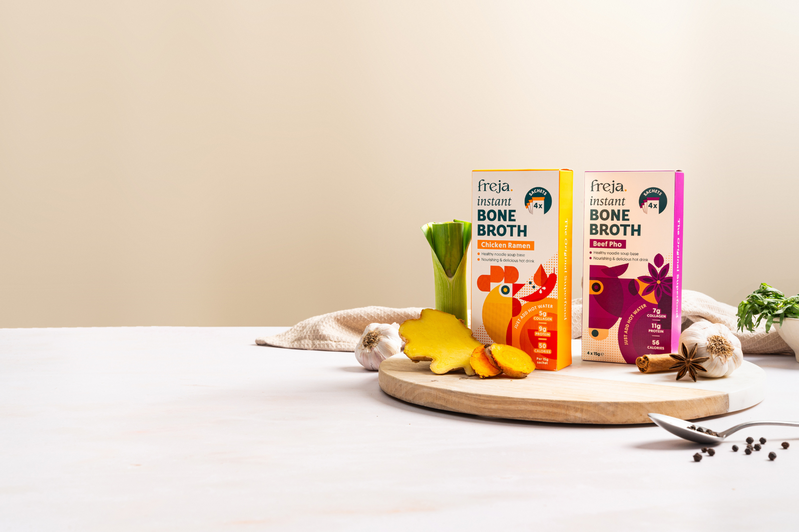 Whether you drink on the go or use as a nourishing base for noodle soups, each high-protein, low-calorie sachet also contains natural collagen, amino acids and electrolytes.